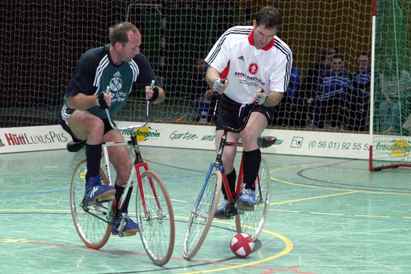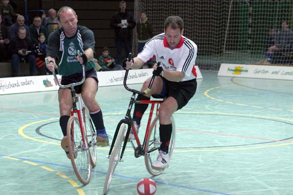 Die Zuschauer waren sehr schnell begeistert, denn die Heimmannschaft (Lange/Brede) lag überraschend gegen die ehemaligen Weltmeister aus Hameln (Hormann/Latzel) sehr früh mit 3:0 in Front. Die Gäste wurden zusehens nervöser und konnten nur ein Tor im ersten Abschnitt erzielen. Die zweite Hälfte bot weiterhin attraktiven Radball, bei dem aber sich die bessere Erfahrung letztendlich durchsetzte. ![]() ![]() ![]() ![]() ![]() ![]() ![]() ![]() |