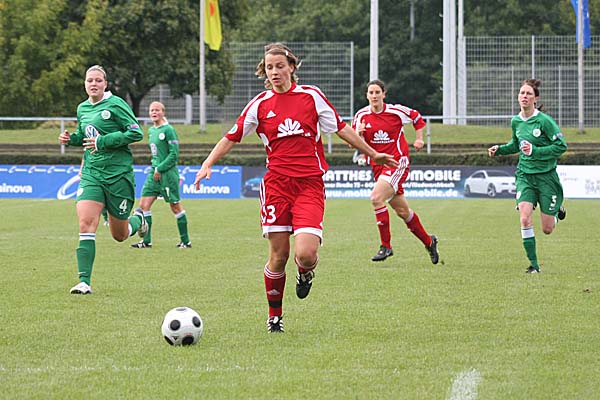 Wolfsburg war fortan vor allem durch lange Bälle aus dem Frankfurter Mittelfeld gefährdet - zum Beispiel stand Birgit Prinz nach einem solchen in der 29. Minute frei vor Rissling, doch die Wolfsburger Torfrau konnte den Schuss blocken,