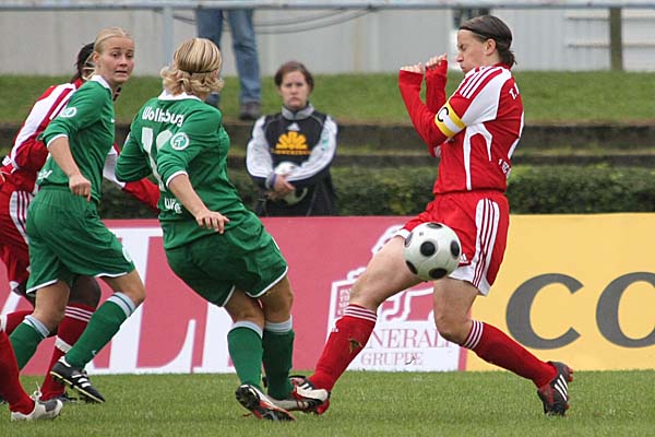 können, doch diese kleine - und auch letztlich unverdiente - Wolfsburger Hoffnung machte Petra Wimbersky mit ihrem dritten Treffer zunichte. Nachdem Wolfsburg eine Frankfurter Ecke nicht aus der Gefahrenzone brachte, erwischte die Frankfurterin einen Sonntagsschuss