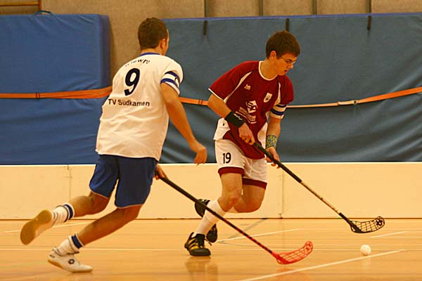 Nachdem bereits im September ein erster Spieltag stattgefunden hatte, traf sich die Regionalliga West am 13.10.2007 zum zweiten Aufeinandertreffen in Münster. Den Auftakt machte das Team aus Südkamen gegen den West-Meister aus Hochdahl, der als klarer Favorit in die Partie ging. Die Partie war nicht gerade ein munterer Auftakt in den zweiten Spieltag: Hochdachl, die keine Auswechselspieler hatten, agierte sehr statisch und versuchte Kräfte zu sparen - manchmal eher zu viel als zu wenig, denn Südkamen kam dadurch sogar zum ersten Treffer der Partie. Der Favorit schien sich dann aber durchzusetzen, drei sichere Kombinationen führten zum 1:3-Pausenstand. Doch Südkamen steckte nicht auf, nach der Pause folgten zwei Tore und somit der Ausgleich. In der Partie war nun spürbar mehr Fahrt und Dynamik, was allerdings auch zu Lücken in der sonst relativ kompakten Abwehr der Underdogs führte. Die routinierten Hochdahler nutzten diese Gelegenheiten eiskalt aus und gingen mit 5:3 in Führung. Letztlich war dies der Grundstein für einen knappen Sieg in einem schwachen Spiel - Südkamen kam zwar nochmal heran, aber am 6:5-Sieg der Hochdahler änderte dies nichts mehr.